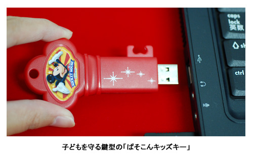 PCのUSBポートに挿し込むだけでむだけで自動的にアカウントが子ども専用の「キッズモード」に切り替わり、有害サイトへのアクセスをブロックしたり、使用できるソフト・ファイルを制限。「ぱそこんキッズキー」を引き抜くと自動的にログアウトし、保護者のアカウントログイン画面に戻る。子どもたちが安心してインターネットを使えるよう、初期設定のWebブラウザを子ども専用ポータルサイト「Yahoo!きっず」に設定。有害サイトへの接続を防ぐため、ブラウザにはURLが入力できないようになっている。