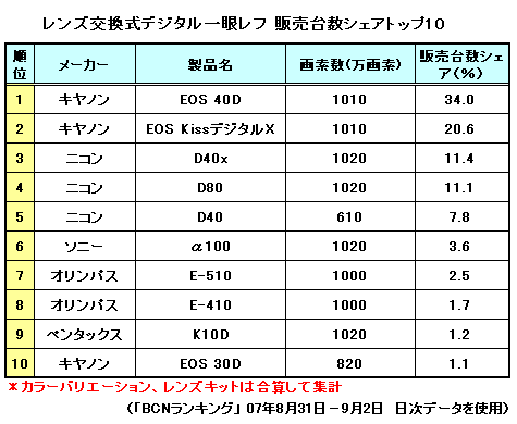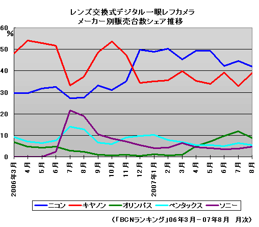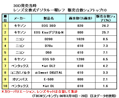 昨年3月、キヤノンは「30D」発売を経て、48.1%のメーカー別シェアを獲得。前月までシェア1位を僅差で争っていたニコンに大差をつけてトップに立った。同年7月にはソニーのデジタル一眼レフ「α100」やペンタックス「K100D」の発売でメーカーシェアを33.3%にまで落とすが、キヤノンのシェア1位は揺るがなかった。9月にはエントリー向け一眼レフ「EOS KissデジタルX」発売で再びシェアを48.6%に回復し、11月まで9か月連続メーカー別シェア1位を獲得した。