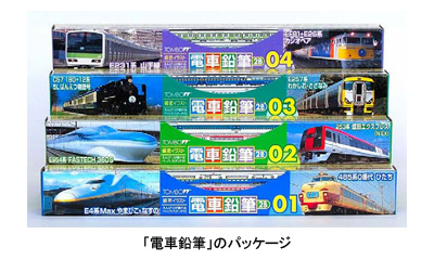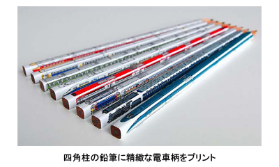 四角軸(四角柱)の鉛筆に印刷や塗装を施して電車に見立てた特殊鉛筆。車両の図面や写真を基資料に忠実な車両イラストを作成し、ドライオフセット印刷技術を駆使して四角鉛筆の3面に電車柄をプリントした。