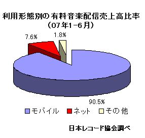 07年上半期(1-6月)の有料音楽配信全体の売り上げは351億9300万円で、前年同期比で42%増と堅調な伸びを示した。特に好調だったのが「モバイル」で43%伸びて318億5900万円を売り上げた。一方「インターネットダウンロード」の売り上げは26億8600万円で8%増にとどまった。構成比では「モバイル」が90.5%を占めた。
