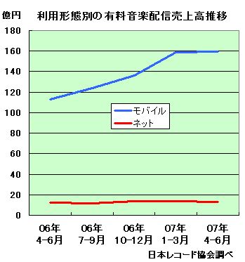 日本レコード協会は9月4日、加盟全社の売り上げを集計した07年第1四半期、第2四半期と、07年上半期の有料音楽配信売上実績を発表した。これによると、日本の有料音楽配信市場は、依然として携帯電話などの「モバイル」用途がけん引している実態が明らかになった。