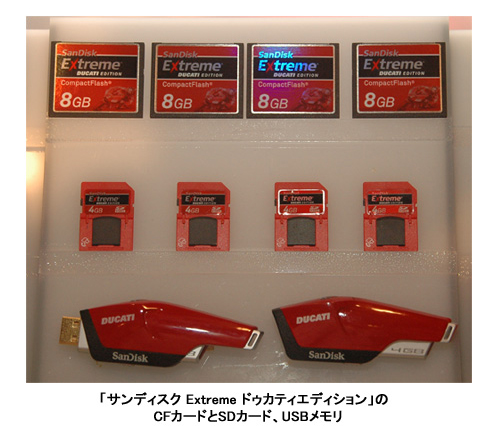CFカードの「Extreme ドゥカティエディション コンパクトフラッシュ」は、プロカメラマン向けでデータ転送速度は毎秒45MB。同社のフラッシュメモリのなかで最速を実現した。容量は4GBと8GBの2種類。