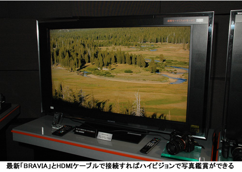 軽量化も追求。ボディ素材はマグネシウム合金を採用しながら、約690gの重さを実現した。家電メーカーの強みを生かした「観る」楽しみについてもこだわり、本体にHDMI端子を装備し、ハイビジョン対応テレビとHDMIケーブルで接続すれば、撮影した写真をハイビジョン画質で楽しめる。さらに「ブラビア プレミアムフォト」に対応する同社製液晶テレビ「BRAVIA(ブラビア)」と組み合わせれば、写真鑑賞に最適化された画質モードに自動で切り替わり、写真が持つ繊細さや自然な階調表現、色合いなどを忠実に再現できる。