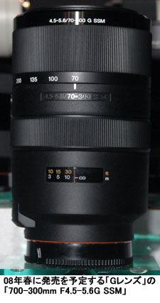 ソニーでは開発中のレンズ「700-300mm F4.5-5.6G SSM」も同時に発表した。「700-300mm F4.5-5.6G SSM」は、色やズームレンズ特有の画像の歪曲といった収差を抑え高い画質を追求したレンズシリーズ「Gレンズ」のズームレンズ。SSM(超音波モーター)を内蔵しており、高速なAFが可能。発売は08年春の予定で、価格は未定。