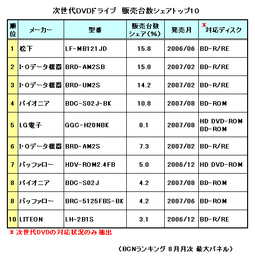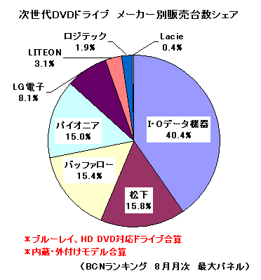 パソコンと接続する光学ドライブには「内蔵型」と「外付型」の2種類がある。内蔵型はATAやシリアルATAなどの規格のケーブルでパソコンと接続、デスクトップPCに組み込む。一方外付型は、USBで接続するため、デスクトップ、ノートとも増設が可能だ。今回はこの中から、BDかHD DVDに対応するドライブを「次世代DVDドライブ」として集計した。8月のBCNランキングで1位を獲得したのは、内蔵型でBDの書き込みに対応した松下製ドライブ「LF-MB121JD」。販売台数シェア15.8%だった。