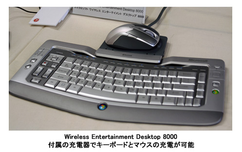 マウスとキーボードのセットモデルは、「Wireless Entertainment Desktop 8000」と「Wired Desktop 500」の2種類。「Wireless Entertainment Desktop 8000」は、ワイヤレス方式のキーボードとレーザーマウス、USBポート付き充電器のセット。通信方式は2.4GHzのBluetoothで、PCにBluetoothトランシーバーを接続することで、最大10m遠く離れた場所からワイヤレスで操作できる。付属の充電器は板状のユニークな形状で、キーボードとマウスを当てるだけで充電可能。また4基のUSBポートを搭載し、USBハブとしても活用できる。