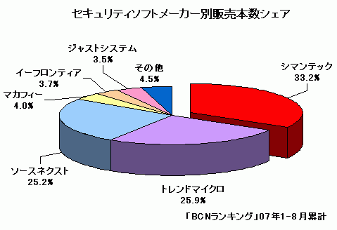 シマンテックは、BCNランキングのセキュリティソフト部門で、6年連続して販売本数でトップシェアを走り続けている。しかし、昨年からシェアは下降傾向。これまで年間販売本数シェアは一貫して40%以上をキープしていたが、07年1-8月の累計シェアでは33.2%。25.9%まで追い上げている2位のトレンドマイクロとの差は7.28ポイントに縮まってきた。そこで「返金金額は過去最高」(シマンテック幹部)のキャッシュバックキャンペーンを実施。2位以下メーカーを突き放しにかかる。