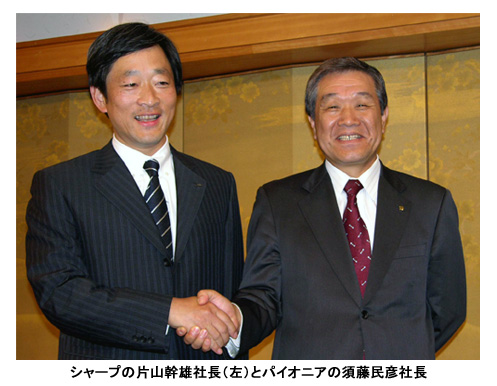 業務提携では、次世代DVDなど4分野で両社の技術の相互利用による共同開発を進める。とくに映像分野では、パイオニアがシャープの液晶技術を活用して、「プラズマテレビに加え液晶テレビをラインアップに加える」(須藤社長)計画を明らかにした。また、次世代DVD分野では、シャープの青紫色半導体レーザーなどのデバイス技術と、パイオニアのドライブモジュール技術などの光ディスク技術を有効に活用した製品の開発を目指す。