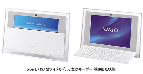 22型ワイドモデルは、奥行きわずか約18cmで、壁掛け設置にも対応。上位機種「VGC-LT80DB」は、次世代DVDのブルーレイディスク(BD)書き込み対応ドライブも搭載する。19型ワイドモデルは奥行きは約17cm。22型ワイド、19型ワイドモデルはワイヤレスキーボード、マウスが付属する。一方、最も薄い奥行き約14cmの15.4型ワイドモデルはバッテリーを内蔵し、キーボード部分を本体と一体化させ、ノートPCのように持ち運ぶことができる。