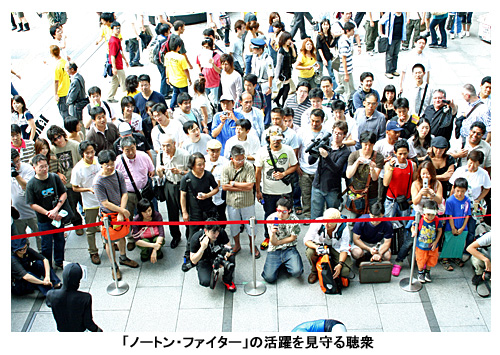 会場には、三連休の初日とあって外国人観光客や通行人など多くの見物客でごった返し、携帯電話のカメラやデジカメで撮影するなど、「ノートン・ファイター」活躍を笑顔交りに凝視。一般消費者には初めてのお披露目だったが、まずは上々の人気ぶりだった。