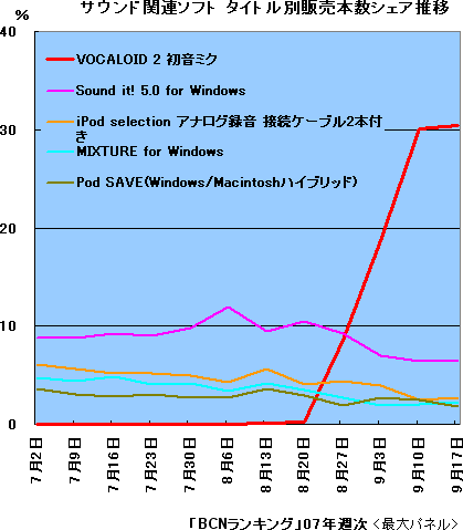 BCNランキングのサウンド関連ソフトでも、「初音ミク」はダントツの売上げを続けている。何しろ製品別の販売数量シェアでは、発売からわすか3週でシェア30%を突破して9月17-23日では30.4%を記録。2位の「Sound it! 5.0 for Windows」(INTERNET)の4倍以上のシェアを獲得しているのである。