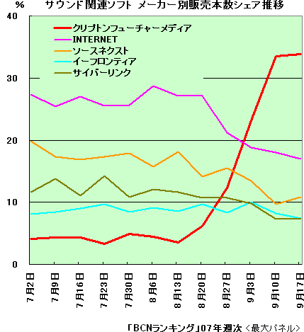 メーカー別の販売数量で見ても、それまでクリプトン・フューチャー・メディアのシェアは6%を超えることはなかったが、「初音ミク」発売と同時にシェアが爆発。9月17-23日のランキングでは、実にメーカーシェア約33.9%を占めるまでに急成長している。