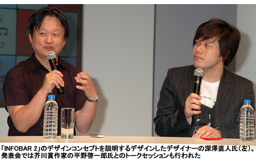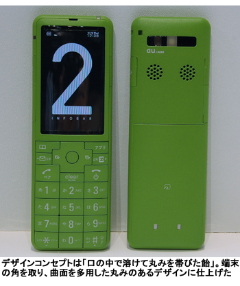 初代の「INFOBAR」と同様、デザインはデザイナーの深澤直人氏が担当。デザインコンセプトは「口の中で溶けて丸みを帯びた飴」で、端末の角を取り、曲面を多用した丸みのある携帯電話に仕上げた。