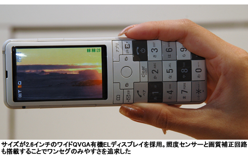デザインを追求する一方、ワンセグの受信機能など最新機能も盛り込んだ。ディスプレイには色の再現性や高コントラストに優れる有機ELを採用。サイズは2.6インチのワイドQVGA。有機ELは第6弾モデルの「MEDIA SKIN」でも使用しているが、今回の有機ELは輝度を30%向上させた。