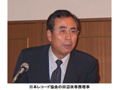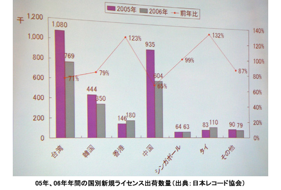 まず冒頭に、日本レコード協会の田辺攻専務理事が概況報告を行った。このなかで、「台湾、韓国、香港」順で日本の楽曲が売れているとしてそれぞれの傾向についても言及。新たに楽曲を販売する権利(新規ライセンス)を得たCDなどの06年出荷数量では、台湾が76万9000枚で前年比71%、韓国が35万枚で同79%と下降気味だが、一方香港は18万枚で同123%と伸びている実態を示した。