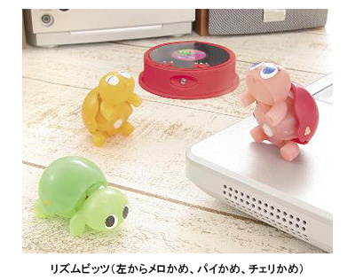 「リズムビッツ」は、音の高低を聞き分け、高音だと前方へ低音だと後方へ、トコトコお尻をふりながら踊るカメ型ペットロボット。レコード盤の形をした付属の赤外線コントローラが音をキャッチし、高音・低音を解析。これを赤外線に変換して「リズムビッツ」に信号を送信すると踊り始める。