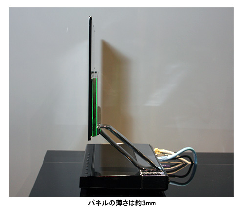 パネルには、独自の技術で開口率と光の取り出し効率を高めた自社開発の有機ELパネル「オーガニックパネル」を採用。有機ELは自発光方式のためバックライトが不要。そのため、液晶やプラズマテレビよりも薄型化が可能だが、ソニーではさらに、有機EL素子をパネル内に完全に固定する構造を開発することで、最薄部約3mmという超薄型パネルに仕上げた。
