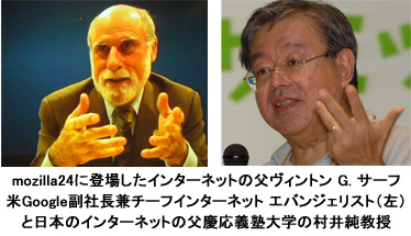 Mozillaの日本法人、Mozilla Japanは活発に活動しており、9月には初の24時間イベント「mozilla24」を開いたばかり。ロックコンサートやTシャツ作りなどのイベントのほか、慶応大学や京都大学、米スタンフォード大学を始め、ハワイ、マレーシア、タイ、フランスの各会場とインターネットで動画接続しパネルディスカッションも開催した。最後のセッションでは、TCP/IP プロトコルを設計した「インターネットの父」ヴィントン G. サーフ米Google副社長兼チーフインターネットエバンジェリストも登場。「日本のインターネットの父」ともいわれる、慶応義塾大学の村井純教授との活発なディスカッションも繰り広げた。