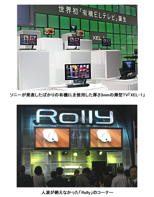 AV関連機器が集まった「デジタルネットワークステージ/ホーム&パーソナルゾーン」エリアでは、主要家電メーカーが存在感を発揮。ソニーは、有機ELパネルを採用した厚さ3mmの11V型テレビ「XEL-1」ほか、27V型の有機ELテレビを展示。また、サウンドエンターテインメントプレーヤー「Rolly」の専用デモンストレーションコーナーを開設し、実際に音楽にあわせて本体が動く様子を来場者に披露した。
