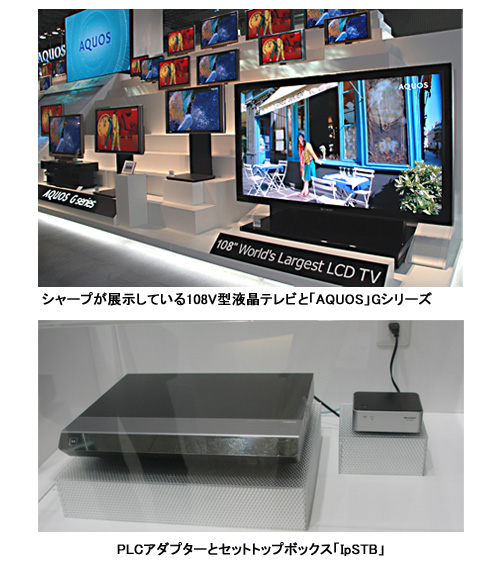 シャープは、最薄部20mmの液晶テレビ、108V型の大型液晶テレビを公開。日立製作所も最薄部19mmの次世代薄型液晶テレビを公開し、「薄型の追求」がテレビメーカーの共通キーワードになっていることを鮮明に印象付けた。テレビ以外では、シャープがPLCアダプターを使ってインターネット上の映像を受信しテレビで視聴するHDD内蔵のセットトップボックス「IpSTB」を展示した。