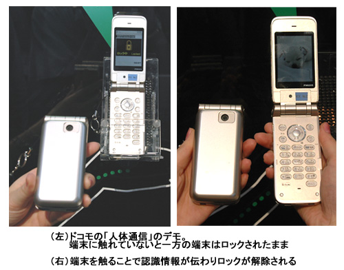 NTTドコモは、人の体を通信媒体として情報をやり取りする「人体通信」の技術を公開。「人体通信」は、人間が持つ微弱電流を使って通信を行い携帯電話を取り出すことなく認証や決済が行えるテクノロジー。一例として、2つの携帯電話を使い、1つの携帯電話を持ちながらロックされたもう一方の携帯電話を持つと、人体通信で認証情報が送られロックを解除するデモを行った。