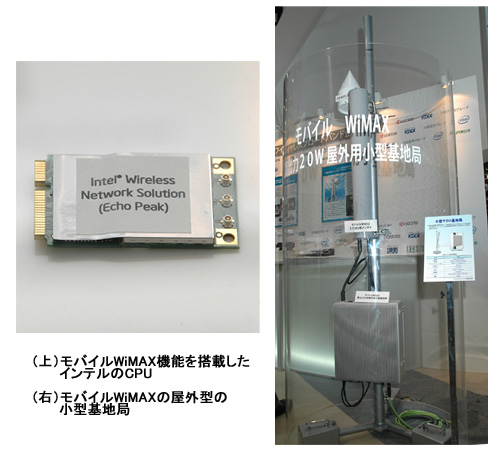 KDDIは、モバイルWiMAX(ワイマックス)の関連技術を展示。インテルのモバイルWiMAX機能を搭載したCPUや、CPUなどのモジュールを組み込んだノートPC、基地局に設置するアンテナなどを披露した。