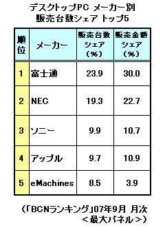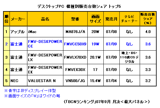 このほか9月のランキングでは、2.4GHzのCore 2 Duoと20インチワイド液晶を搭載した「MA877J/A」がシェア1.8%で13位、20インチモデルより視野角が広く、高精細な24インチワイド液晶を搭載した「MA878J/A」はシェア0.9%で32位に入った。1位の「MA876J/A」とその他の2モデルにはかなり販売台数に開きがあり、性能よりコストパフォーマンス重視の傾向がうかがえる。
