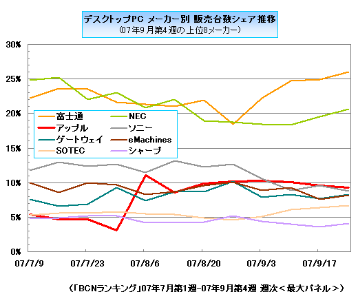 アップルがフルモデルチェンジして8月8日に発売した、液晶一体型のオールインワンパソコン「iMac」が好調だ。9月のデスクトップPC機種別ランキングでは、エントリーモデルの「MA876J/A」が1位を獲得。メーカー別シェアでも、過去1年間で最大の9.7%に達した。今やiPodの印象が勝っている感のあるアップルだが、ここに来てパソコンにも勢いが出てきた。「BCNランキング」でその動きを追った。