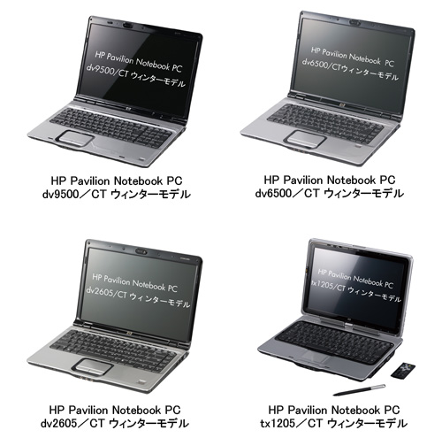 「HP Pavilion Notebook PC tx1205/CTウィンターモデル」は、タッチパネル対応の12.1インチワイド液晶を搭載したモバイルノートPC。ディスプレイは180度回転可能で、タブレットスタイルでも使用可能。きょう体デザインは、今回発表したモデルで唯一「ZEN-design shizuku(雫)」を採用した。CPUはAthlon 64 X2 TK-55、Turion 64 X2 TL-58/TL-62から選択でき、価格は12万3900円から。
