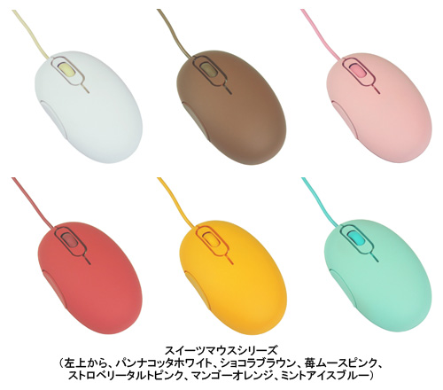 「スイーツマウス」は、パンナコッタ、ショコラ、苺ムース、ストロベリータルト、マンゴープリン、ミントアイスをイメージした全6色のカラーバリエーションが特徴。マウス本体だけでなく、ホイールボタンやケーブル、USBコネクタまで同じ色を採用し、カラーコーディネートにこだわった。