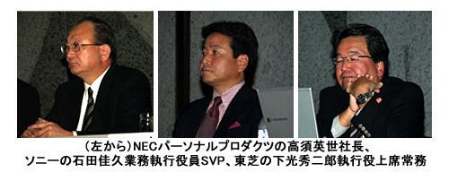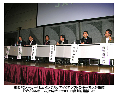 テーマは、「パソコンが拓くデジタルホームの未来」。デジタル化した家庭「デジタルホーム」のなかで、「パソコンはどんな役割を果たすのか」をメインに各社持論を展開した。登壇者は、NECパーソナルプロダクツの高須英世社長、ソニーの石田佳久・業務執行役員SVPVAIO事業本部本部長、東芝の下光秀二郎・執行役上席常務PC&ネットワーク社社長、富士通の五十嵐一浩・経営執行役パーソナルビジネス本部長に加え、インテルの吉田和正共同社長とマイクロソフトの眞柄泰利・執行役専務デジタルライフスタイル推進・OEM担当が参加。各メーカーともに今のPC業界を背負って立つキーパーソンだ。