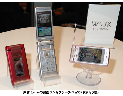 「W53K」は、厚さ15.4mmのきょう体に2.7インチのワイドQVGA液晶を採用。液晶を回転するだけでワンセグが立ち上がる一発起動機能やテンキーを長押しするだけで事前に登録した相手に発信する「ワンタッチダイヤル」を搭載した。カメラは有効197万画素。サイズは幅49×高さ106×厚さ15.4mmで、重さは約130g。カラーはパッショネイトレッド、ルミナスシルバー、シャンパンピンク。