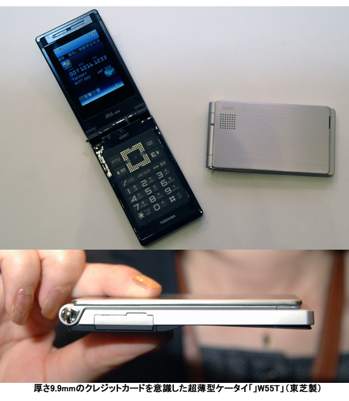 また、デザインにこだわった東芝の超薄型端末「W55T」をラインアップした。「W55T」は、薄さ9.9mmでクレジットカードサイズを意識した超薄型端末。ディスプレイは2.4インチのQVGAクリアスクリーン液晶で、カメラは有効196万画素。男性をターゲットにしており、ステンレス素材を使い、ヘアライン処理や鏡面処理で金属感を出したデザインを採用した。カラーはブリーズゴールド、カームピンク、ゲイルブラックで、3000台の限定ネット販売でプレミアムバージョンも販売する。サイズは幅54×高さ99×厚さ9.9mm、重さは約104g。