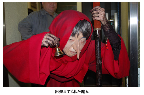 会場は都内の雑居ビル地下1階にある、とあるバー。小雨が降りしきる寒い夕方、会場まで到着すると赤いフードをかぶった「魔女」が立ち、「お入り」としゃがれた声で迎えてくれた。足元が見えないほど薄暗い階段を下って店内に入ると、そこはまるでお化け屋敷のような異様な雰囲気。ろうそくの明かりだけの薄暗い店内を、「暴君ハバネロの下僕」たちが、来場者に「暴君ハバネロ」の新商品をふるまっていた。