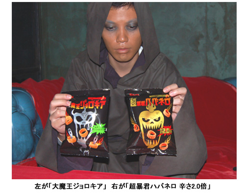 一方「大魔王ジョロキア」は、07年2月にギネスブックで世界一辛いトウガラシとして認定された「Bhut Jolokia(バフット・ジョロキア)」を使用したポテトスナック。「バフット・ジョロキア」はインド原産のトウガラシで、トウガラシの辛さを示すスコヴィル値はハバネロの約2倍ほど。