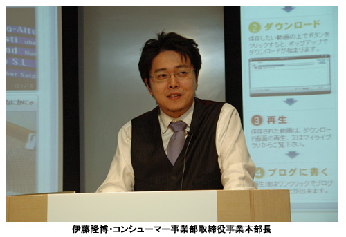 「CliPlog」の開発には、USENでインターネット事業や、NHN Japanのオンラインゲーム「ハンゲーム」で本部長を務めた伊藤隆博・コンシューマー事業部取締役事業本部長が指揮。「動画とコミュニケーションを楽しむNO.1サイトを目指す」と意気込みを語った。