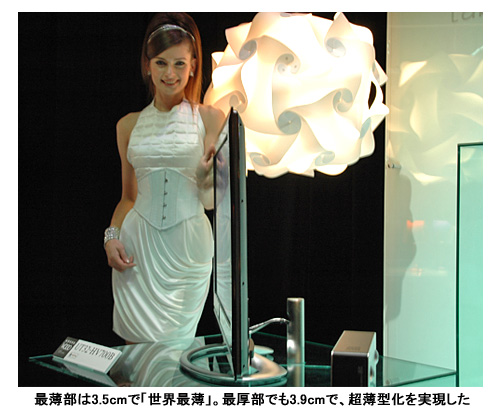 超薄型パネルモジュールと熱解析技術、超薄型電源を採用し、構造設計を見直したことで、最薄部3.5cm、最厚部3.9cmの薄さを実現。32V型以上の一般家庭用ハイビジョン液晶テレビのモニタ部としては世界最薄という。モニタとテレビチューナー部を分離させる新構造で軽量化を図ると同時に、設置の自由度も高めた。液晶パネルは、新たに開発したIPS方式の「IPSαパネル」を搭載。視野角は上下左右とも178度、コントラスト比は10000:1。スピーカーは、薄型に適した出力6W+6Wのボックスタイプのスピーカーを採用した。