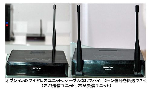 また、別売りのワイヤレスユニット「TP-WL700H」を使えば、HDMIケーブルを使わずにハイビジョン信号を伝送し、モニタと「Wooo ステーション」を無線で接続できる。モニタと「Wooo ステーション」にそれぞれワイヤレスユニットをつなげる仕組みで、最大9m離れた場所から伝送可能。
