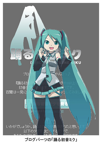 FLASH技術をベースにし、ユーザーがインタラクティブに操作可能なブログパーツで、タグをブログに貼り付けるだけで組み込むことができる。「踊る初音ミク」は、ボタンをクリックすることで画面中央にダイナミックなアニメーションを表示し、「口パクで踊る」「口を閉じて踊る」などの振り付けを選択できる。また、バックミュージックを50曲の中から自由に再生することもできる。