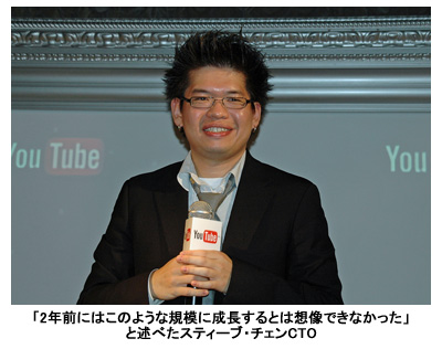チェンCTOは冒頭挨拶で日本語を披露し、YouTube創業した2年前から現在までの軌跡を説明。「2年前の05年1月、友達とのパーティーで、撮影したビデオを共有する術がないことに気付いたのがきっかけ」と創業秘話を明かし、「05年12月の正式オープン時では、1日に300万回ビデオが再生され、今では1日に数億回再生され、数10万種類の新しい動画がアップされている。1分間で7時間分の動画がアップさせており、全ての動画を視聴するのは不可能」と急成長していることを強調した。