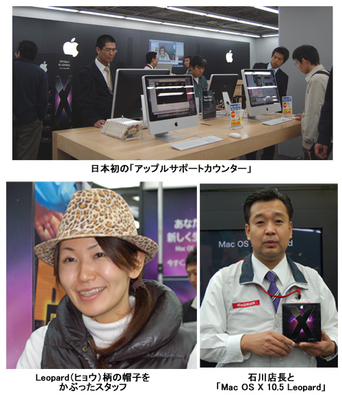 また、ビックカメラ有楽町店では、「Leopard」の発売に合わせて、日本初の「アップルサポートカウンター」を設置。iPodのバッテリーがその場で交換できるほか、Macの日本語キーボードから英語キーボードへの交換もできる。このほか、26日-28日の3日間に限り、Leopard(ヒョウ)柄の帽子をかぶったスタッフにある「キーワード」を告げるとオリジナルグッズをプレゼントするイベントを実施する。この「キーワード」は、店頭で実施するデモンストレーション中に告げられるという。