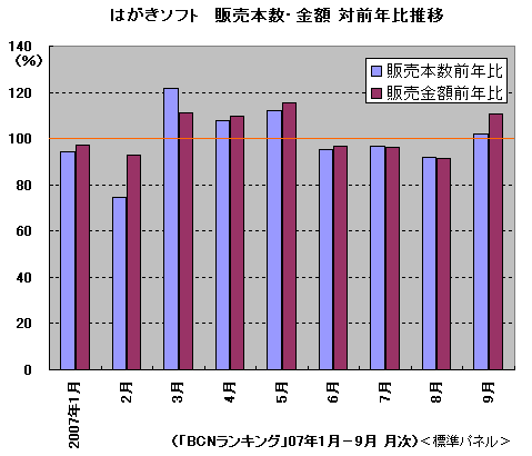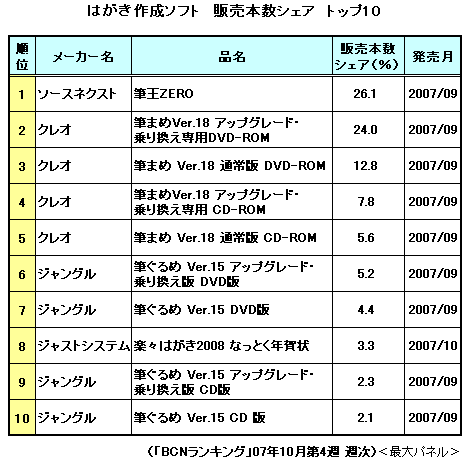 06年のはがきソフト全体の市場規模は、ソフトの発売後から最も売れる時期である9月から12月で販売本数・金額推移ともに大きく縮小傾向にあった。その影響か07年はメーカー側にも大きな動きがあった。07年3月にソースネクストがイーフロンティアから「筆王」の著作権・商標権を取得し、9月7日に「筆王ZERO」として発売。9月には「筆ぐるめ」を開発していた富士ソフトが、ジャングルとの提携を発表し、同月14日に発売になった「筆ぐるめ Ver.15」からソフトの販売をジャングルが手掛けることになった。さらに同月、マイクロソフトが同社のはがきソフト「はがきスタジオ 2007」の新製品開発を終了すると発表した。