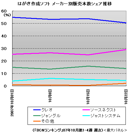 07年は、各社が新製品を発売した直後の9月は06年の販売本数比で101.8%、金額比で110.5%とやや上昇傾向にある。第4週(10月22?28日)でメーカーシェア別に見みると、1位はシェア50.5%で「筆まめ」を販売しているクレオ、2位はソースネクストでシェアは29.0%。3位はシェア14.0%でジャングルだ。直近の4週間(10月1?28日)で推移を見てみると、やはり優位なのは常に50%以上のシェアを確保しているクレオ。2位のソースネクストはわずかながら伸びてきている。製品ブランドの再編成が続き更新料ゼロという新戦略も飛び出した、はがき作成ソフト市場。毎年、年賀状そのものの需要が徐々に縮小していくなか、どこまで市場を維持・拡大できるかに注目したい。