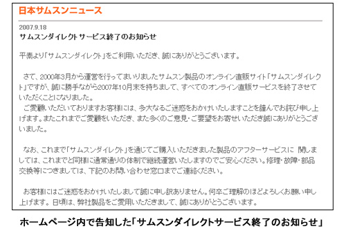 日本サムスンは11月9日、日本での液晶テレビなどの個人向け家電販売事業から完全に撤退する方針を明らかにした。06年夏には店頭販売を終了しており、07年10月末には同社の直販サイト「サムスンダイレクト」での販売も終わらせていた。