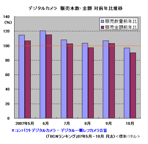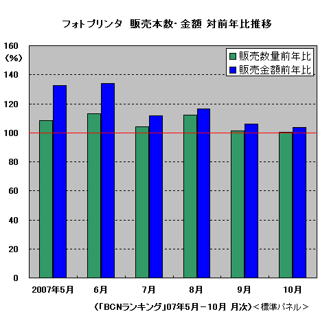 ところで、07年5月?10月の半年間でプリンタ市場全体の対前年比をみると、販売台数で93.4%、販売金額で89.9%と前年割れの水準にとどまっている。しかしフォトプリンタに限ると、台数で105.9%、金額で114.9%と、前年を上回る水準で堅調だ。同じくデジカメ市場の前年比も販売台数で106.3%、金額で101.2%と伸びていることもあり、手軽なフォトプリンタを使ってデジカメ写真のプリントを楽しむ人が増えている、とみることもできそうだ。せっかく撮った写真もPCに保存してメールで送るだけではもったいない。バッテリ対応のモデルなら外にだって持ち出せる。フォトプリンタで手軽に撮ったその場でプリントができる楽しみを味わってみてはどうだろうか。(BCN・岡本浩一)
