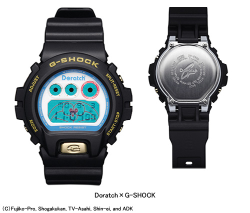 「Doratch×G-SHOCK」は、08年5月に25周年を迎える「G-SHOCK」の人気モデル「DW-6900」をベースにしたキャラクター腕時計。バックライトを点灯するとドラえもんが覗き込むデザインになり、文字盤にはドラえもんをイメージさせるカラーリングを施した。また、ベルトはG-SHOCK25周年の記念ロゴを入れ、裏蓋には「Doratch×G-SHOCKのロゴ」も刻印する。時計のサイズは高さ53.2×幅50.0×奥行き16.3mm、重さは66g。