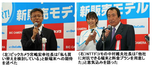 イベントには中村維夫・NTTドコモ社長と、ビックカメラの宮嶋宏幸社長、石川勝芳執行役員営業部長兼有楽町店店長が出席。最初に宮嶋社長が「待ちに待ったドコモの最新端末、冬商戦を大いに盛り上げてくれることを期待する」と挨拶した。
