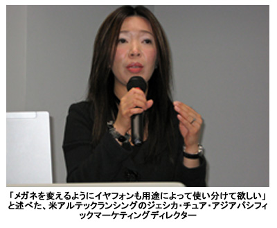 会見で米アルテックランシングのジェシカ・チュア・アジアパシフィックマーケティングディレクターは、「多様なライフスタイルに合わせたラインアップを用意した、メガネを変えるようにイヤフォンも用途によって使い分けて欲しい」と話した。