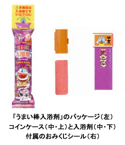 入浴剤は1回分で、大きさは直径28mm、長さ75mm、重さは55g。パッケージ内容は、入浴剤1個とプラスチック製のコインケース1個、「大当たり」が出ると「うまい棒布団カバーセット」がもらえる「おみくじシール」1枚。コインケースには10円玉を30枚まで貯めることが可能で、付属のおみくじシールを貼れば、「うまい棒」風コインケースになる。