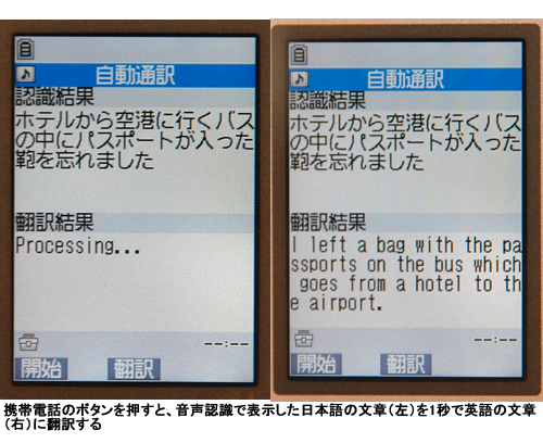 また、ミドルウェアで2つのソフトを包括することで、メールソフトやブラウザからも音声認識・翻訳機能を呼び出せるようにし、同時に、端末の機能を損なうことなく、どんな携帯電話でも利用可能にした。英語以外の外国語の翻訳も可能という。